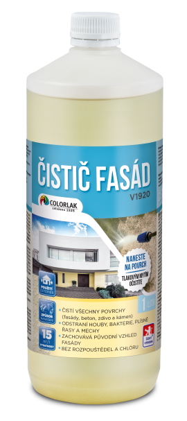 ČISTIČ FASÁD V1920 je určen k čištění fasád, zdiva, betonu, omítek, kamene, střešní krytiny a dalších minerálních ploch proti biologickému napadení (houby, bakterie, plísně, řasy). Zabraňuje růstu mechů v exteriéru. ČISTIČ FASÁD má široké využití, lze jej použít např. i na zámkovou dlažbu, sochy, pomníky apod. Kromě likvidace poskytuje V1920 i preventivní ochranu proti novému vzniku biologického napadení. Pro posílení dlouhodobější preventivní ochrany již očištěné plochy je vhodné použít OCHRANU FASÁD V1930. ČISTIČ FASÁD V1920 neobsahuje chlor, nezapáchá a nehrozí nebezpečí změny odstínu fasády. Plochy opatřené ČISTIČEM FASÁD nesmí přijít do styku s potravinami, krmivy a pitnou vodou. Výrobek nesmí být použit pro nátěry dětského nábytku a hraček.