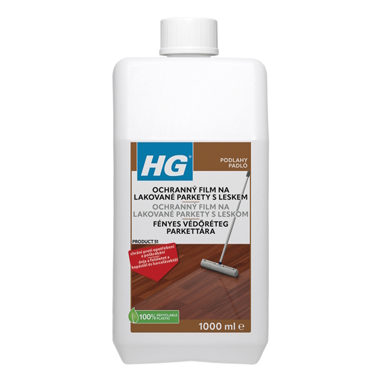 HG ochranný film s leskem pro parketové podlahy (p.e. Polish) (HG výrobek 51) je tekutá polymerová emulze, která se snadno nanáší a po zaschnutí vytvárí lesklý a tenoučký, ale velice pevný ochranný film. Tím se lakovaná vrstva plovoucí podlahy chrání proti opotřebení, škrábancům a jinému poškození. Tento ochranný film poskytuje rovnež protiskluzový úcinek.