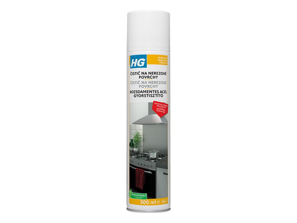 HG rychlý čistič na nerezové povrchy je účinný, profesionální čistící přípravek na rychlé a snadné odstraňování mastnoty, špíny a otisku prstu z nerezové oceli, chromu a hliníku, který nenechává naprosto žádné šmouhy. Proto je tento výrobek ideální na čištění vařičů, omyvatelných stěn za sporákem, digestoří, ledniček, mikrovlnek atd. HG rychlý čistič na nerezové povrchy navíc vytváří neviditelnou ochrannou vrstvu, díky níž lze špínu příště odstranit ješte snadneji.