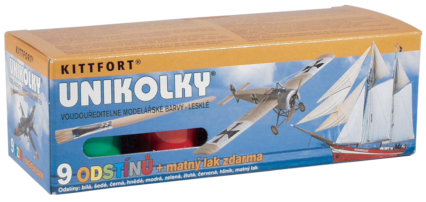 - Kittfort vodou ředitelné modelařské barvy lesklé včetně matného laku Unikolky 9 ks + 1 ks