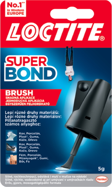 LOCTITE® Super Bond Brush je jednosložkové vteřinové tekuté lepidlo s praktickým aplikátorem. Je určen pro domácí použití a vytváří silné vazby mezi širokou škálou běžných materiálů. Je to ideální lepidlo pro lepení materiálů, jako jsou plasty, gumy, kovy, dřevo, keramika, kůže, textilie, papírový karton a papír.