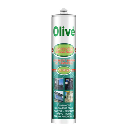 Acetický univerzální silikonový tmel OLIVÉ MP – Multiuso. Vhodný obecně pro stavebnictví a sklenářské práce, autoopravny: těsnění motorů a převodovek. Po vytvrzení vytváří trvale pružný spoj, odolávající UV záření a povětrnostním podmínkám. Tepelná odolnost od -45 °C do +180 °C.