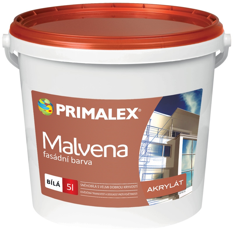 Primalex MALVENA je fasádní vysoce kvalitní čistě akrylátová barva s výbornou kryvostí, vysokou bělostí (min. 89% BaSO4) a odolností proti nepříznivým vnějším povětrnostním vlivům (vč. kyselých dešťů). Po zaschnutí je nátěr mrazuvzdorný. Společně s přirozenou odolností proti mytí a drhnutí i dokonalou prodyšností pro vodní páry je vhodná na všechny druhy fasád.