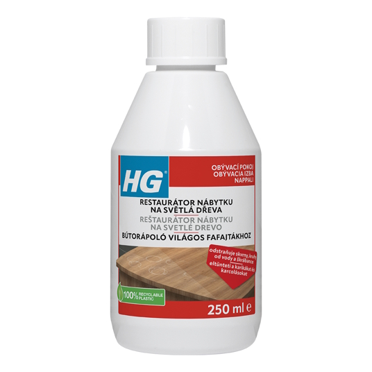 Přípravek HG restautátor nábytku pro světlé druhy dřeva je vysoce kvalitní ošetřující přípravek pro mořený, lakovaný, olejovaný, voskovaný nebo nijak neošetrený nábytek. Skvrny od tekutin jako jsou například kruhy od vody a alkoholu zmizí, zašedlé a vyblelé povrchy získají zpět svou přirozenou barvu, škrábance budou zamaskovány.