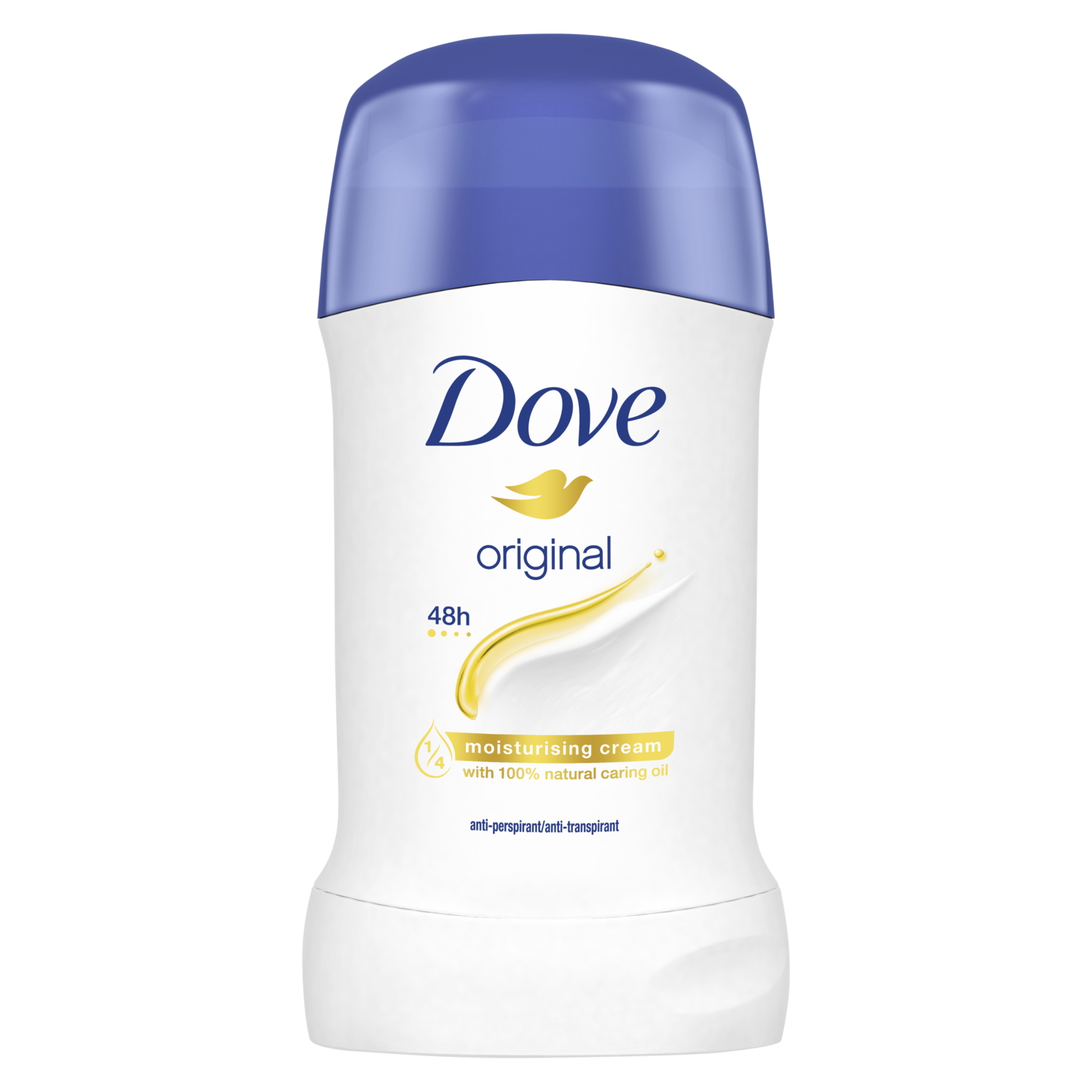 Tuhý antiperspirant Dove Original s ¼ hydratačního krému a 100% přírodním pečujícím olejem pečuje o podpaží a poskytuje až 48 hodin ochrany před pocením.