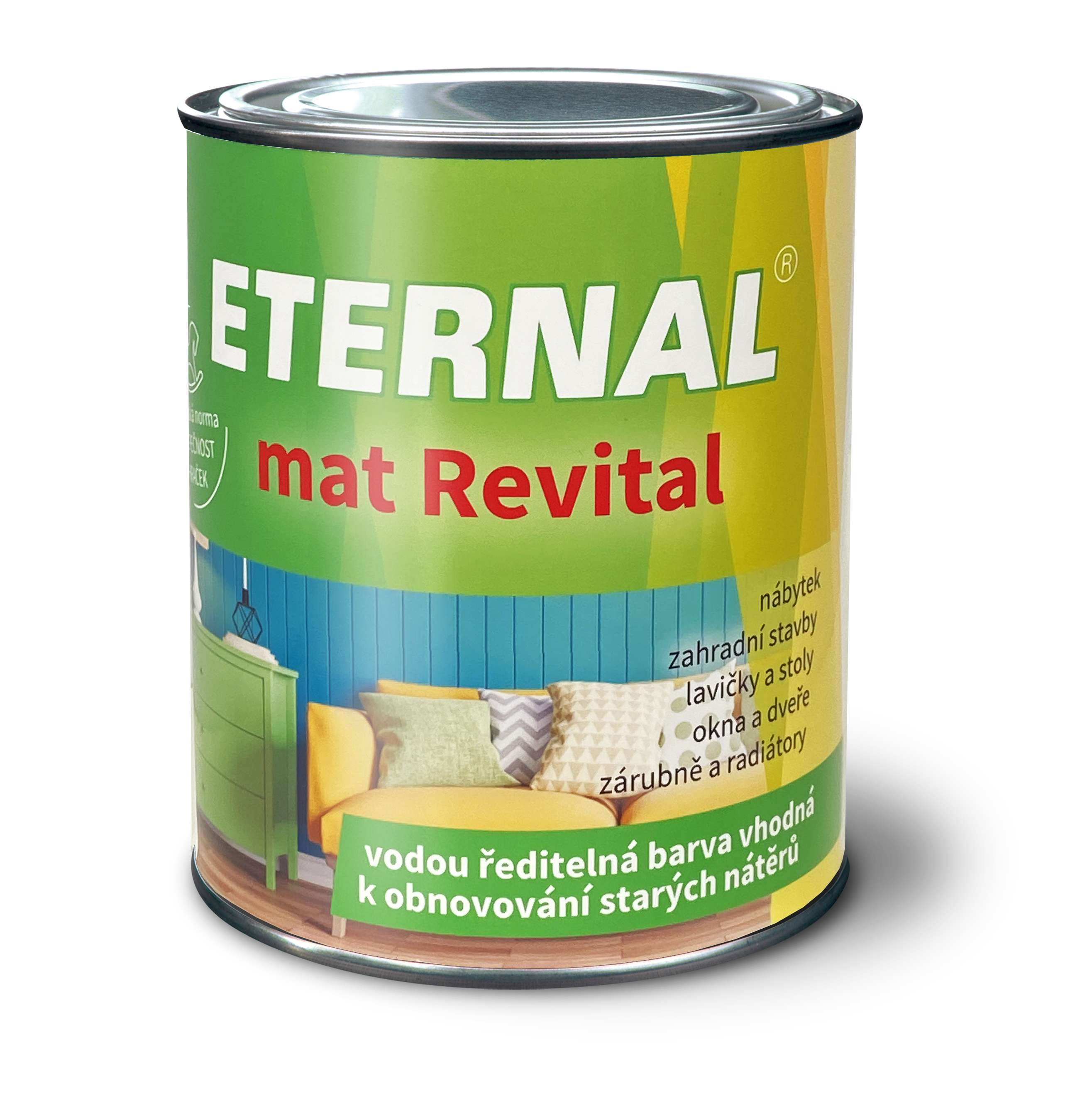 ETERNAL mat Revital je hedvábně matná univerzální vodou ředitelná akrylátová barva pro vnitřní i venkovní použití určená k nátěrům dřeva, kovových podkladů opatřených antikorozním nátěrem, dřevovláknových a dřevotřískových desek, sádrokartonu, nepochozího betonu a některých plastů. Vzhledem k velmi dobré přilnavosti na starých syntetických a olejových nátěrech je velmi vhodný pro obnovovací nátěry.Vyznačuje se velmi dobrou kryvostí, dobrým rozlivem, rychlým zasycháním. Splňuje podmínky evropské normy pro bezpečnost hraček.
