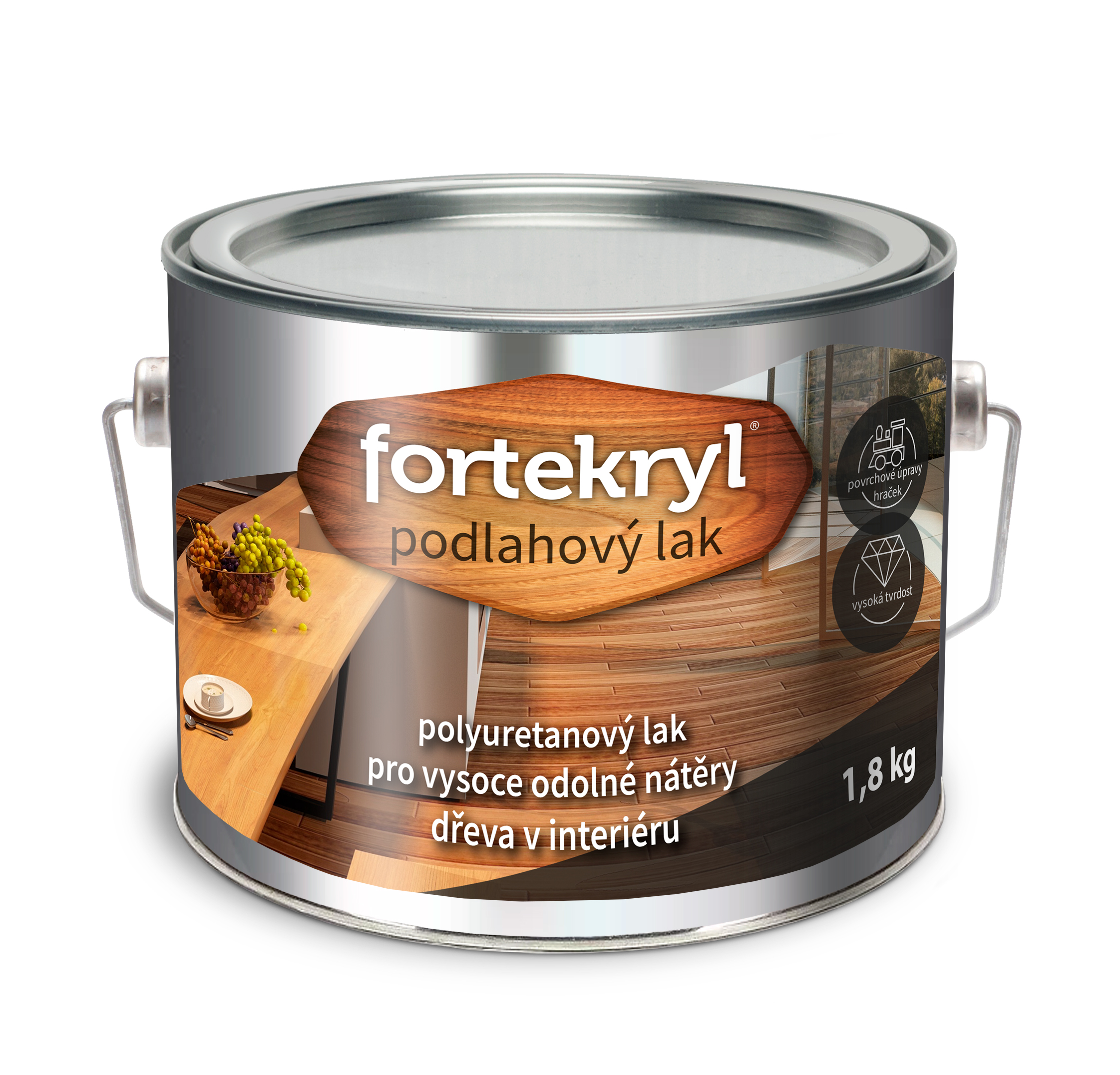 FORTEKRYL podlahový lak je vodou ředitelný lak na bázi čistě polyuretanové pryskyřice. Je určený pro nátěry dřevěných podlah, parket, nábytku v interiéru a dřevěných hraček. Vytváří nežloutnoucí nátěry s velmi rychlým zasycháním, vysokou odolností oděru a tvrdostí. FORTEKRYL podlahový lak vyhovuje ČSN EN 71-3 Bezpečnost hraček migrace určitých prvků.