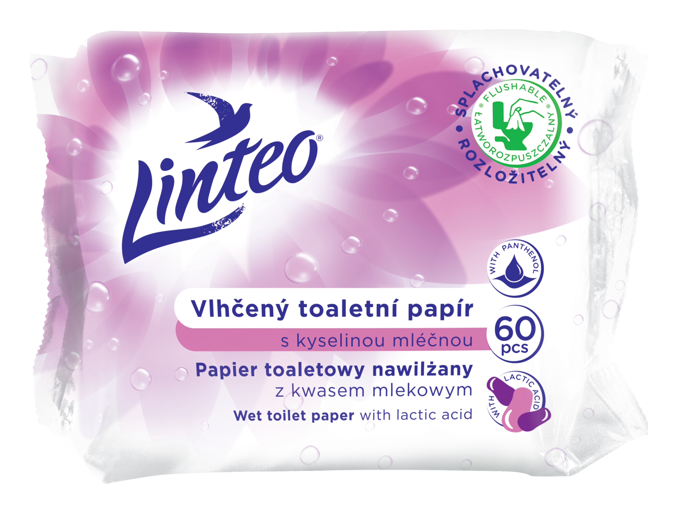 Vlhčený toaletní papír Linteo s kyselinou mléčnou je speciálně navržen pro denní hygienu a péči o intimní oblasti.