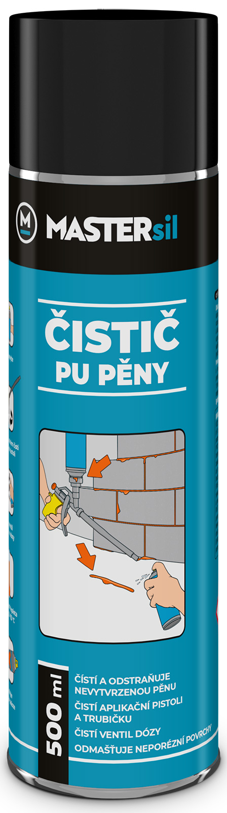 MASTERsil® – Čistič pěny je určen k odstranění čerstvé pěny, k pročištění aplikační pistole na pěnu, k odmaštění podkladu před tmelením, k očištění potřísněného okolí při tmelení a lepení zejména silikonovými tmely.