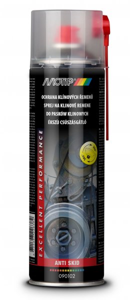 Klínový řemen svého vozu ochráníte pomocí spreje na klínový řemen MOTIP, který napraví a zabrání prokluzování. Vhodné také pro jiná vozidla a stroje. Sprej s vynikající přilnavostí k ochraně klínových řemenů a k nápravě a prevenci prokluzování. Sprej na klínový řemen MOTIP je dilatační (zvětšuje objem a viskozitu) a uživatelsky přívětivý a poskytuje trvalou ochranu. Sprej na klínový řemen MOTIP zpomaluje opotřebení, ošetřuje klínové řemeny a je odolný vůči povětrnostním vlivům.