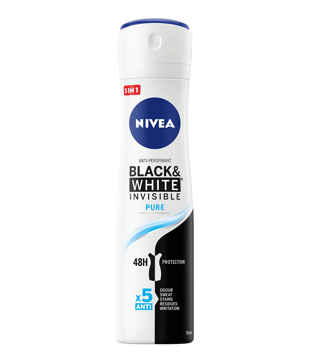 Poznejte skutečně účinný antiperspirant se svěží lehkou vůní, který chrání proti pocení i zápachu a zároveň chrání i vaše oblečení. Laboratoře NIVEA jako vůbec první vyvinuly složení antiperspirantů s unikátní patentovanou technologií, která zabraňuje vzniku bílých stop na černém oblečení a pomáhá předcházet vzniku žlutých skvrn, které se mohou časem objevit na bílém oblečení. Seznamte se se světovou jedničkou v deodorantech nezanechávajících skvrny na oblečení: NIVEA Sprej antiperspirant Black&White Invisible Pure.