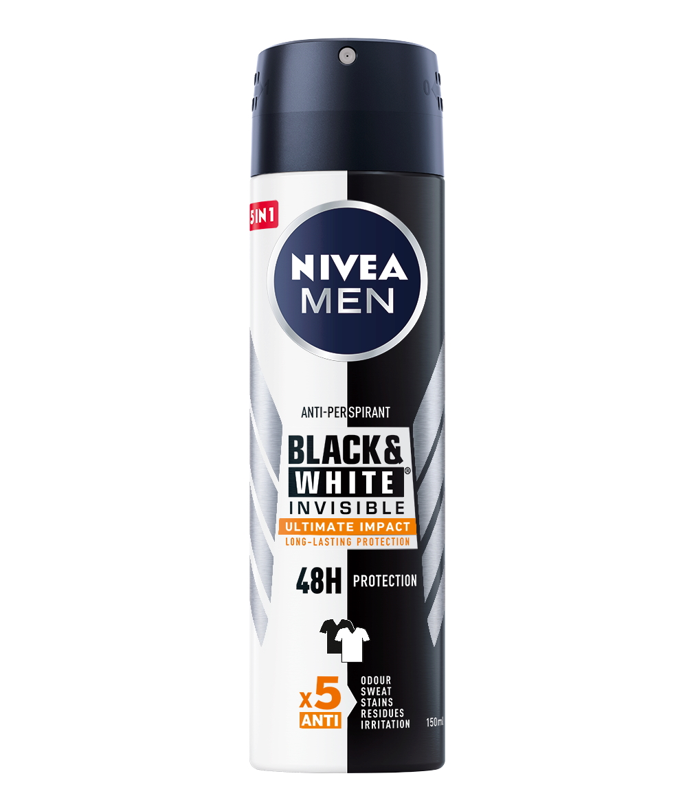 Čekáte od antiperspirantu, že bude silný v boji s potem a zápachem, ale zároveň jemný k vašemu oblíbenému tričku? Sáhněte po pánském antiperspirantu ve spreji se složením bez alkoholu, který zajistí dlouhodobou, účinnou, ale na oblečení neviditelnou ochranu. Dost bylo zpocených koláčů a triček se žlutými nebo bílými skvrnami, které už nejdou odstranit: Seznamte se se světovou jedničkou v deodorantech nezanechávajících skvrny na oblečení: NIVEA MEN Antiperspirant sprej Black & White Invisible Ultimate Impact.
