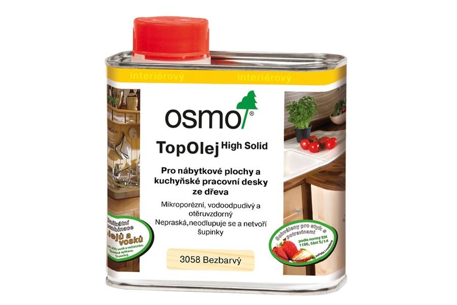 - Osmo olej pro nábytkové plochy a kuchyňské pracovní desky ze dřeva TopOlej High Solid bezbarvý matný (3058) 500 ml