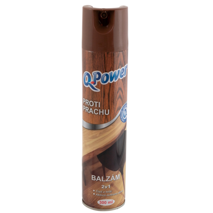 Q power balzám 2v1 během utírání prachu čistí a leští dřevěné povrchy. Přípravek je vhodný na všechny typy dřevěných ploch s povrchovou upravou.