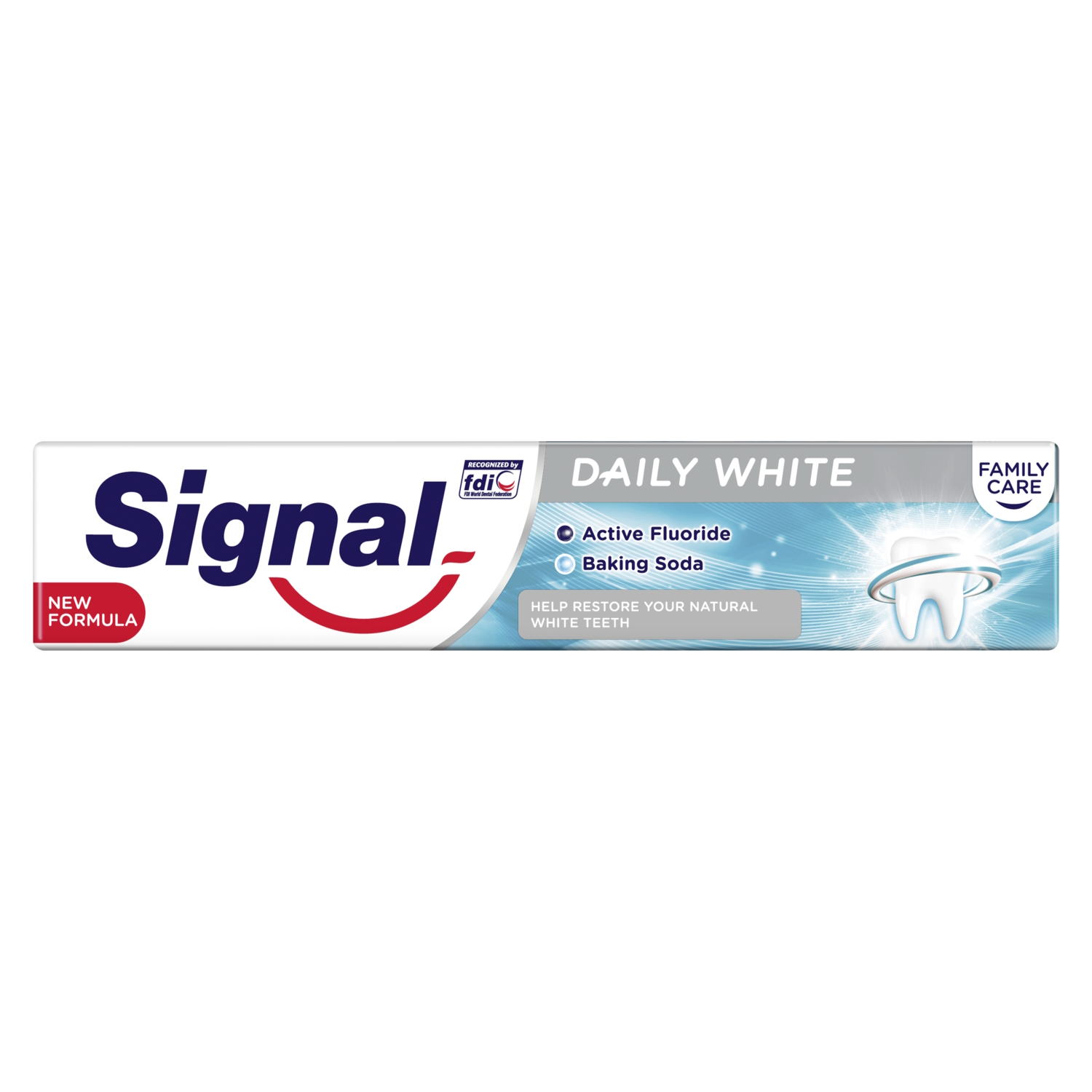 Účinné složení zubní pasty Signal Daily White, obsahující jedlou sodu, důkladně a bezpečně čistí a pomáhá vaší rodině znovu získat přirozenou bělost zubů.