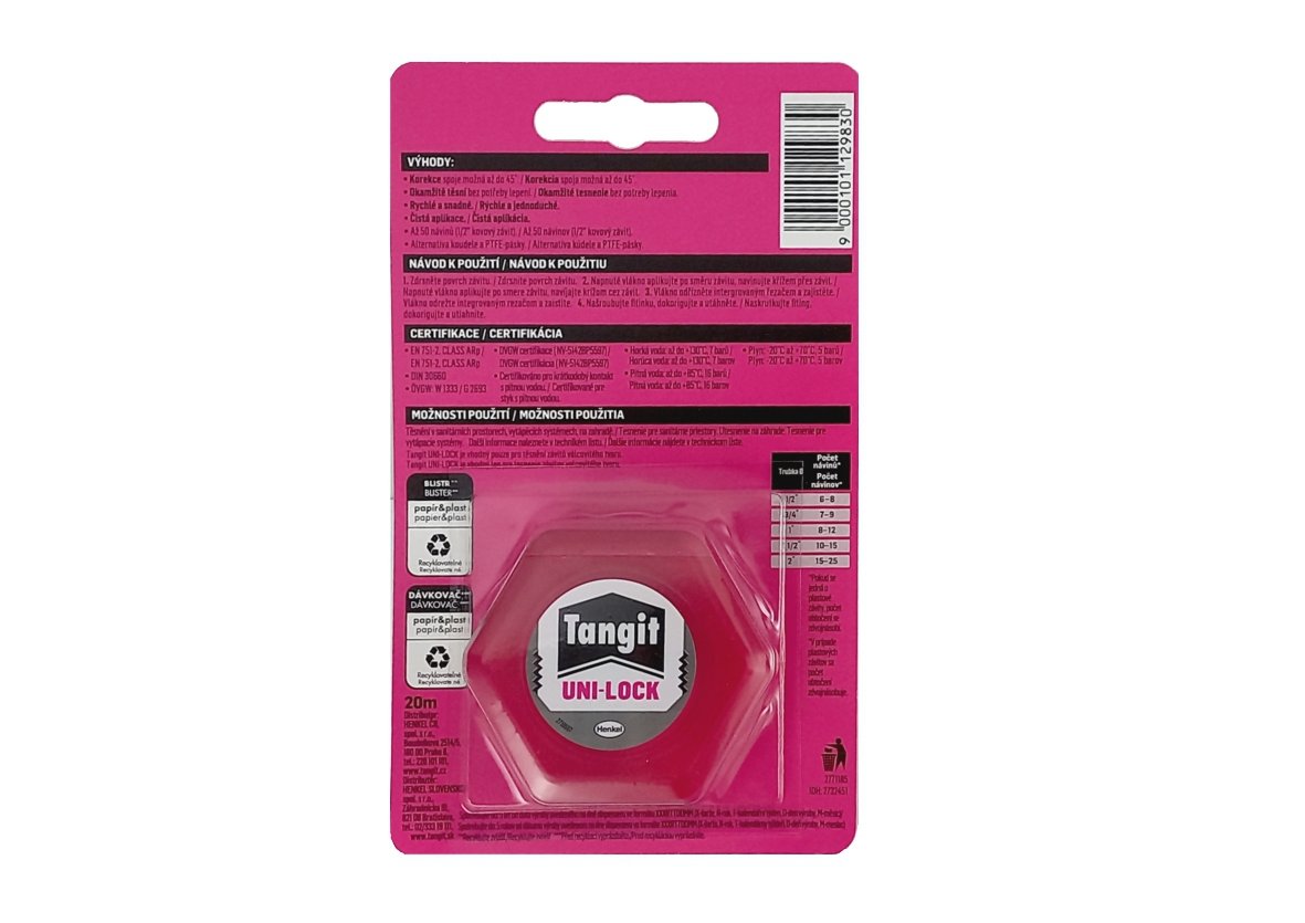 Těsnící vlákno pro všechny kovové i plastové potrubní závity. Jedná se o bezpečnou náhradu tradičních těsnících materiálů jako je konopí, teflonová páska a různé těsnící pasty. Použití vlákna Tangit Uni-Lock je rychlejší, čistější a hned těsní. Doporučuje se k použití na pitnou vodu a je použitelné i na plyn. Materiál je odolný v rozsahu teplot od -20°C do +130°C. Lze použít na kónické i cylindrické závity ze všech kovů a plastů do maximálního průměru 6".