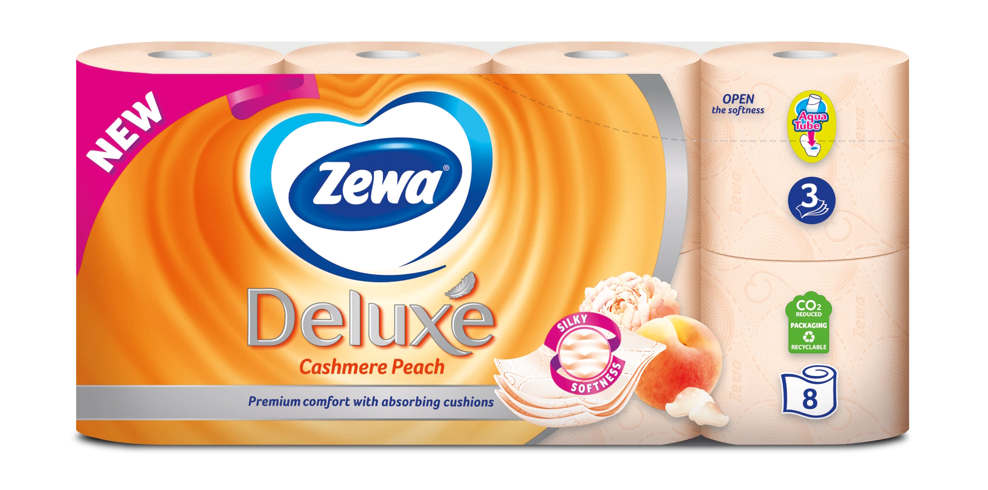 Vpusťte do své koupelny svěží ovocný vánek. Třívrstvý toaletní papír Zewa Deluxe Cashmere Peach přichází do vašich domovů s jemnou vůní broskví. Tento jemný a zároveň pevný papír v atraktivní broskvové barvě si jistě oblíbíte. Embosované logo Zewa vám opět ručí za naši proslulou kvalitu. Řada Deluxe je vyráběna z recyklovaného papíru.